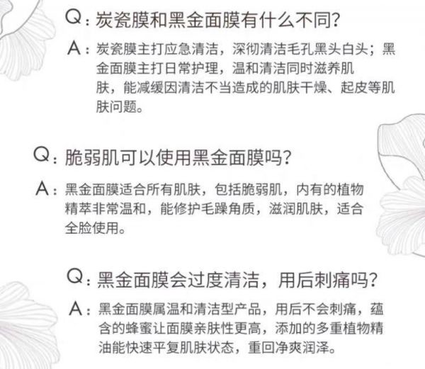 优点:净透毛孔 滋养修护 还原细嫩瓷滑肌。黑色:日本活性竹炭——净透毛孔:强大吸附力,如磁石般吸除毛孔浊质,深彻净透,肌肤匀净细致。金色:4重发酵蜜——舒缓修护:精选发现自墨西哥、阿根廷、加拿大、美国的野生花萃发酵蜂蜜,镇定舒缓,滋养修护清洁后的肌肤,肌肤细嫩瓷滑。高岭土矿泥——平衡控油:高岭土,可温和去除肌肤多余的油脂,帮助恢复肌肤明亮透感,肌肤水油平衡。化妆、熬夜、空气污染…容易带来黑头、闭口、痘痘、毛孔粗大等一系列问题,深层清洁已成为保持肌肤健康的必备习惯。然而,普通清洁面膜往往会导致肌肤的水分迅速流失,刺激肌肤屏障,出现刺痛、辣脸、拔干、紧绷等不适感 。这款黑金面膜净彻毛孔同时,舒缓修护肌肤,不痛不干,还原细嫩瓷滑肌。在深层清洁的同时滋养肌肤,不仅满足中性肌肤和干燥肌肤的肌肤清洁诉求,敏感肌也能放心使用。此款黑金面膜经过配方调整全新推出,里面的日本活性竹炭成分吸附力很强大,能最大限度清洁出毛孔中的皮脂油垢成分,深层净澈肌肤变得通透清爽;同时又以4重野生花萃发酵蜂蜜对清洁后的皮肤进行镇静舒缓,缓解清洁过程中可能会出现的不适,给予肌肤充足的营养变得柔嫩细滑;另外还有高岭土矿泥可以有效吸附皮肤分泌的多余油脂,起到平衡肌肤水油的效果,让肌肤更清爽通透。