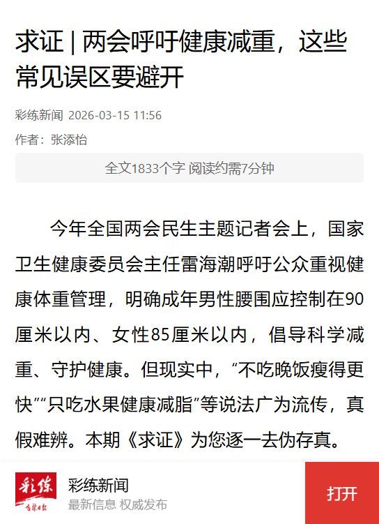今年全国两会民生主题记者会上,国家卫生健康委员会主任雷海潮呼吁公众重视健康体重管理,明确成年男性腰围应控制在90厘米以内、女性85厘米以内,倡导科学减重、守护健康。但现实中,“不吃晚饭瘦得更快”“只吃水果健康减脂”等说法广为流传,真假难辨。本期《求证》为您逐一去伪存真。