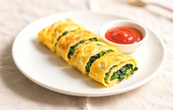 把菠菜焯水切碎混进蛋液,平底锅摊成薄饼后卷起切段,一口一个超方便。早餐带两枚去办公室,上午都不容易饿。