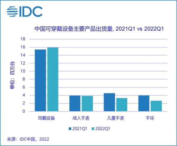 全球市场方面,IDC数据显示,2022年第一季度全球可穿戴设备市场出现首次下滑,总出货量为1.053亿部,同比下降3%。