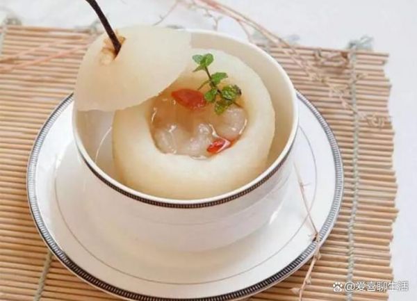 第一种是最经典的冰糖炖梨。将雪梨洗净后削去顶部,挖去梨核,形成一个梨盅。在梨盅内放入适量冰糖和枸杞,盖上梨盖,隔水蒸10分钟即可。蒸好的梨子晶莹剔透,汤汁清甜,具有润肺止咳的功效。特别适合秋冬季节容易咳嗽的人群食用。如果想要增强润燥效果,可以在梨盅内加入少许川贝粉;想要安神助眠,则可以加入几颗莲子。