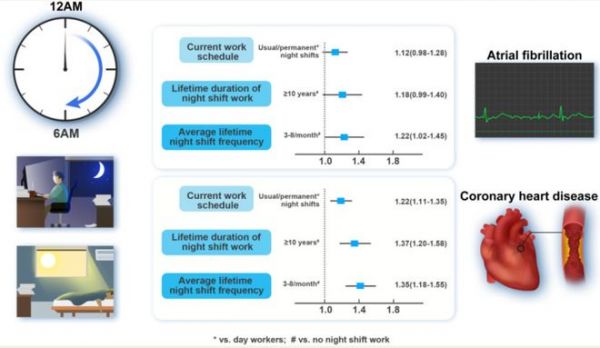 心房颤动 (AF) 是临床实践中管理的最普遍的心律失常,通常作为心力衰竭 (HF) 的原因或后果发生。2017 年全球疾病负担研究表明,全世界约有 3760 万心房颤动 (AF) 患者,包括2017 年有 300 万新发 AF 和 287000 人死于 AF。越来越多的证据表明,轮班工作,尤其是夜班工作,对个人健康和器官有不利影响。夜班工作可能会破坏人体的昼夜节律,影响新陈代谢和激素的分泌,长期夜班工作的影响可能更显著。 因此,夜班与新陈代谢和自主神经系统的各种变化有关可能与 AF 相关;然而,缺乏关于夜班与 AF 关联的数据。