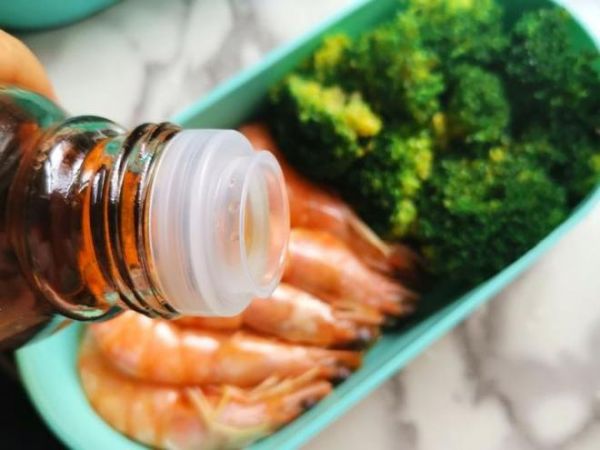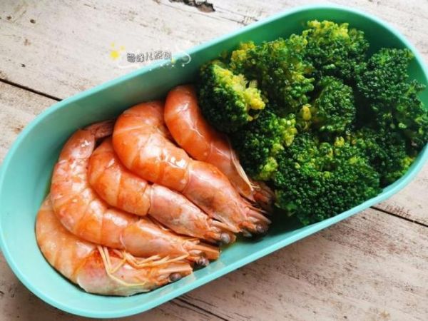 把煮好的鲜虾摆入便当盒中,摆上西兰花,把低脂沙拉汁倒在西兰花上即成。