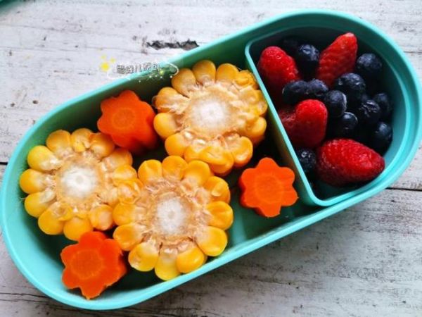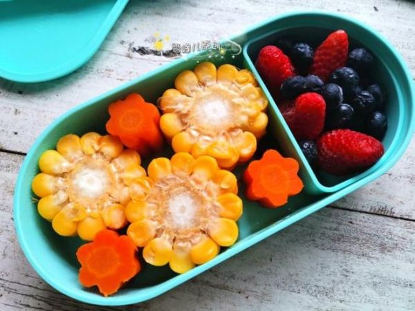 把玉米盒胡萝卜摆好以后,小盒中放入草莓和蓝莓就可以了。
