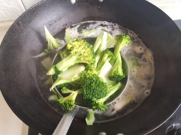 西兰花更简单,用淡盐水清洗,用刀劈成小朵,锅里加入清水烧开,放入西兰花汆烫捞出。