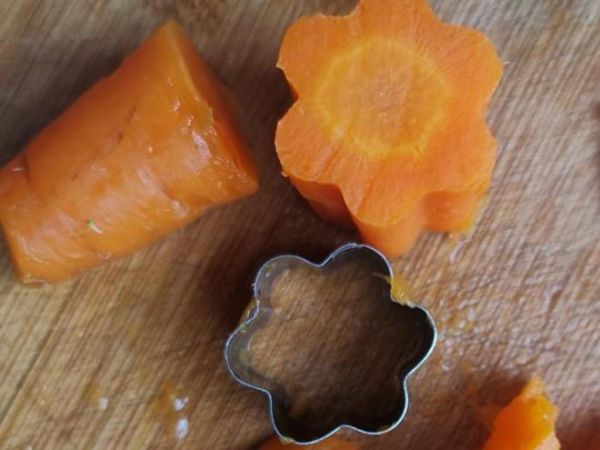 胡萝卜用花形的小模具压出花形摆入便当盒就可以,不但好看而且更诱人。