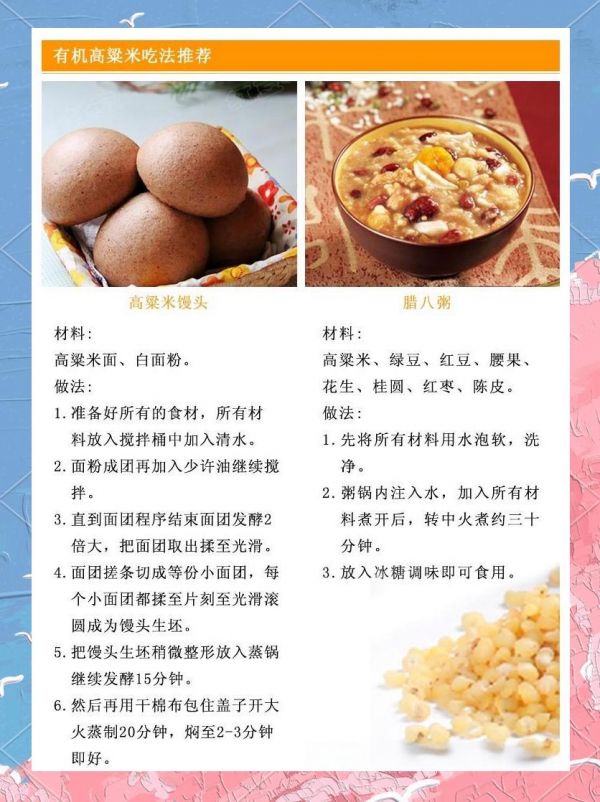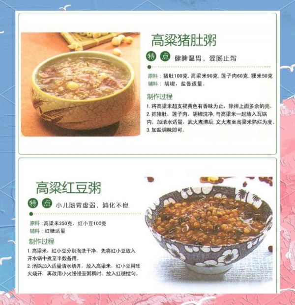 双花高粱粥通过双花与高粱米搭配制成,具有清热解毒的 健康功效。制作时,需将双花与高粱米一同放入锅中,加入料酒和生姜,稍煮后调味即可。