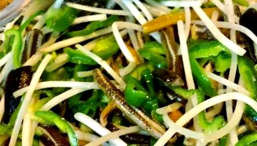 原料:绿豆芽二两、鳝鱼三两、甜椒一个、绿菜椒一个切丝、老姜一小块切丝、盐适量、淀粉一大匙、味精适量加水调成芡汁。