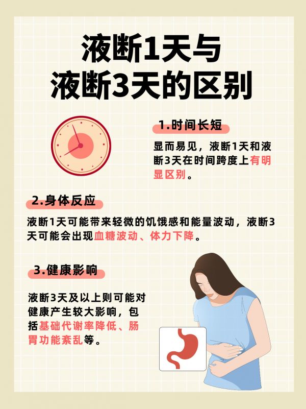 身体反应:短期内,液断1天可能带来轻微的饥饿感和能量波动,而液断3天可能会出现更为显著的代谢变化,如血糖波动、体力下降,以及可能的营养不足现象。
