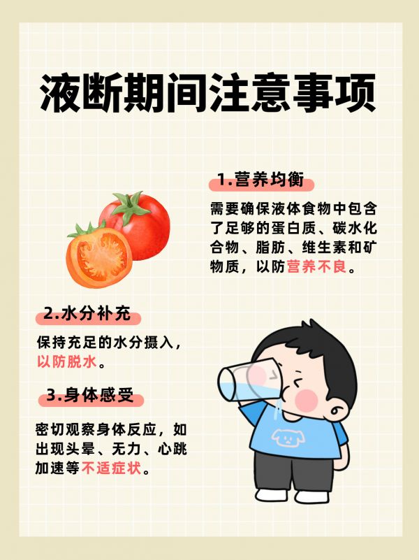 身体感受:密切观察身体反应,如出现头晕、无力、心跳加速等不适症状,应及时停止液断并恢复正常饮食。
