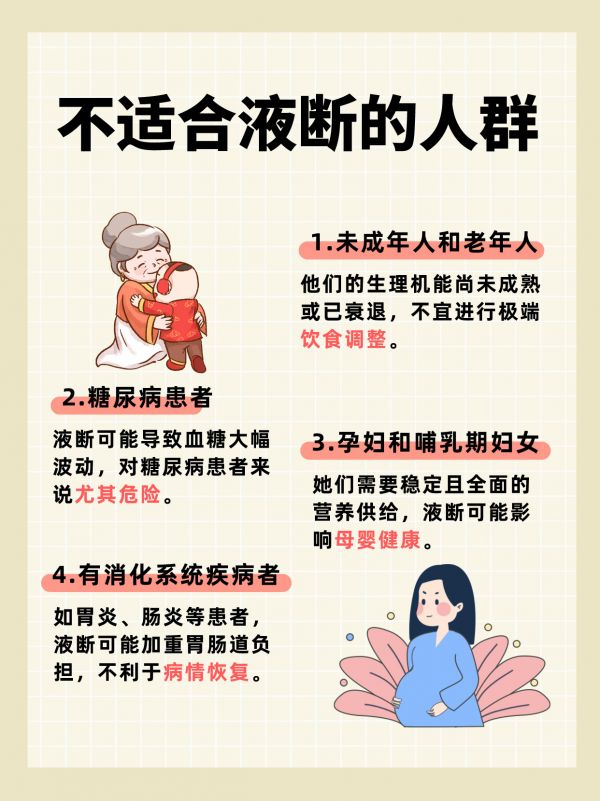 孕妇和哺乳期妇女:她们需要稳定且全面的营养供给,液断可能影响母婴健康。