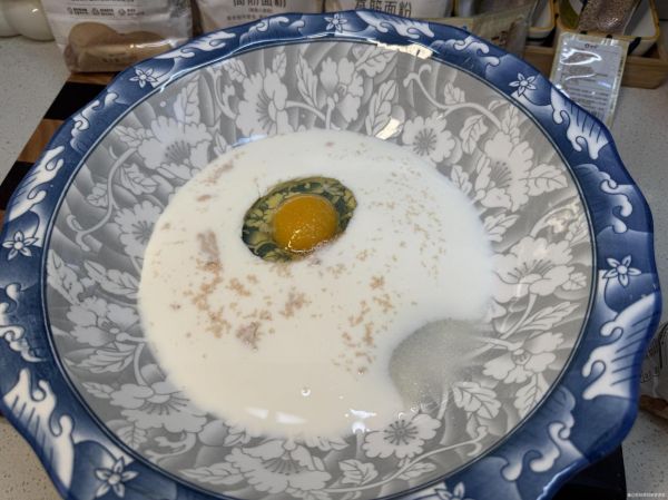 1,将酵母粉,牛奶,鸡蛋和糖先用筷子搅拌均匀,糖用细一点的颗粒,不然天气凉不好融化,这一点糖满意什么甜味,用来促进面团发酵。