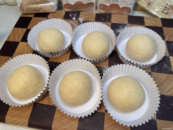 3,最后一次将折叠好的面团分成6等份,分别滚圆后放入纸托中,醒发至原来的两倍大。