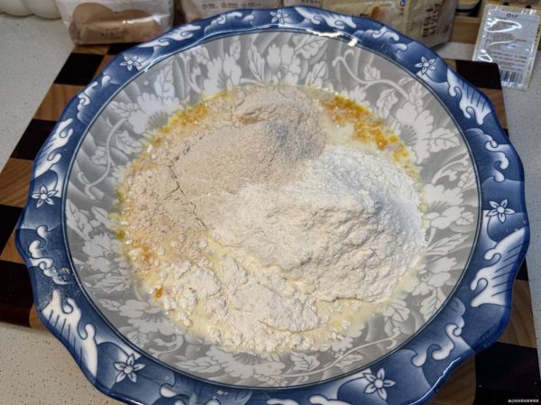 2,然后倒入全麦粉和高筋面粉,无需手揉,用刮刀把食材混合均匀,看不见干面粉就可以了,盖上保鲜膜,放冰箱里冷藏30分钟,然后取出来,手上沾点水防粘,从边上拉起面团往中间折叠,然后盖上保鲜膜,继续冷藏30分钟,再取出折叠,一共重复三次即可,面团的延展性会变得特别好。