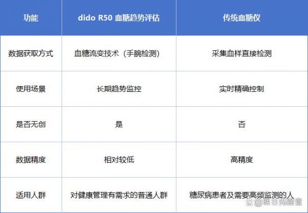 为了更好地理解dido R50血糖手表的血糖评估特点,我们来看看以下对比表: