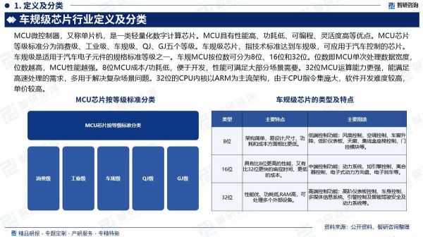 定义及分类:车规级芯片,指技术标准达到车规级,可应用于汽车控制的芯片。车规级是适用于汽车电子元件的规格标准等级之一。车规MCU按位数可分为8位、16位和32位。位数即MCU单次处理数据宽度,位数越高,MCU性能越强。