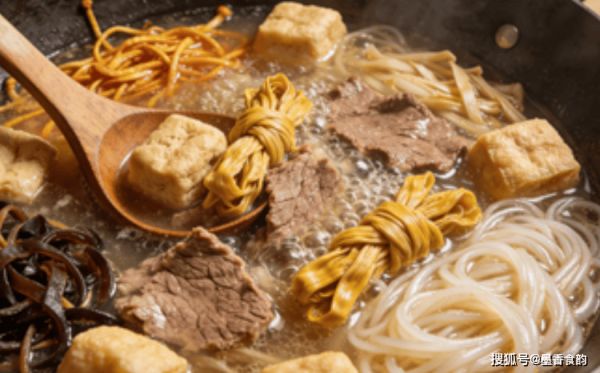 熟牛肉:150克(切片)面筋:100克(手洗面筋或买现成的)黄花菜:30克(干品,提前泡发)黑木耳:30克(干品,提前泡发)红薯粉条:50克(提前泡软)调料: