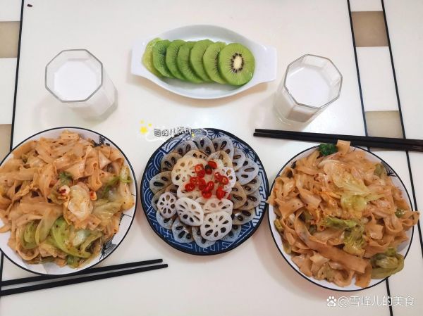 这一餐相对来说简单了很多,炒面、拌莲藕,猕猴桃,炒面中加入了卷心菜和虾肉,好吃还好做,是家人都喜欢的早餐之一。