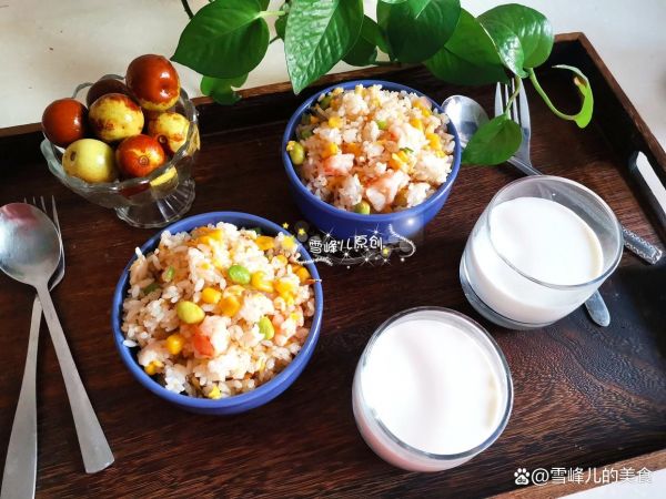 这一餐很普通,也是很多孩子都喜欢的一种早餐,用玉米和豌豆、虾仁搭配炒成的米饭,比扬州炒饭好吃多了,搭配上牛奶,荤素搭配,粗细搭配,非常棒。
