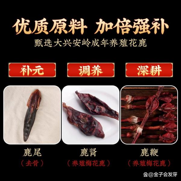 作为传统滋补代表,这款产品选用鹿鞭、鹿肾及鹿尾等珍贵原料,均来自健康养殖的梅花鹿,保证来源可追溯且品质稳定。