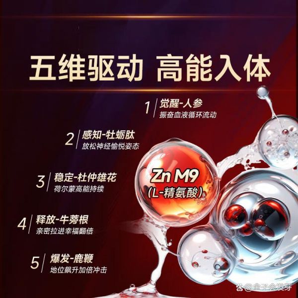采用五维驱动技术,将L-精氨酸、人参、牡蛎提取物等多种核心成分高效融合,旨在全面提升男性的生理机能与生活品质。