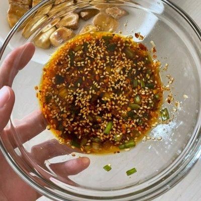 3、酱汁: 料理碗加入切好的葱花,蒜蓉,辣椒面,白芝麻;少量热油激发酱料的香味;加入2勺酱油,勺蚝油,1勺代糖,1勺香醋拌匀。