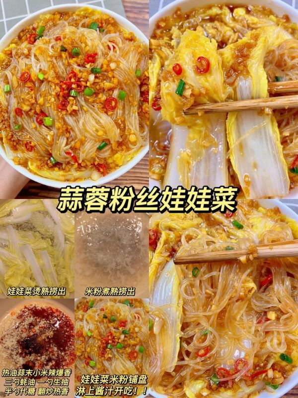 让我们来一道清新爽口的蒜蓉粉丝娃娃菜。将娃娃菜烫熟捞出,米粉也煮熟捞出备用。热油爆香蒜末和小米辣,加入三勺蚝油、一勺生抽和半勺代糖,翻炒至热香四溢。将娃娃菜和米粉铺盘,淋上这香浓的蒜蓉酱汁,一道美味又低脂的蒜蓉粉丝娃娃菜就大功告成了!这道菜不仅口感清新,还能满足你对美味的所有幻想。