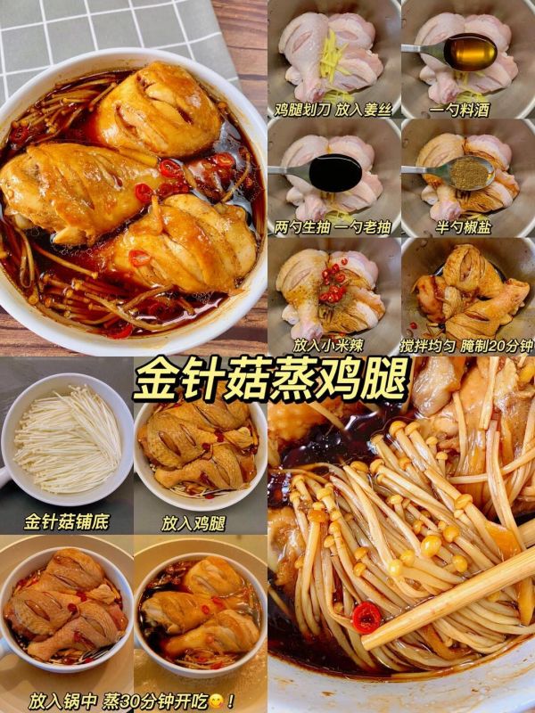 来一道鲜嫩多汁的金针菇蒸鸡腿作为今天的重头戏。首先将鸡腿划刀,放入姜丝、两勺生抽、一勺老抽、一勺料酒和半勺椒盐,搅拌均匀后腌制20分钟。接着,将金针菇铺底,放入腌制好的鸡腿,放入锅中蒸30分钟即可开吃!这道菜鲜嫩多汁,低脂又满足,绝对是减脂餐中的一道硬菜。