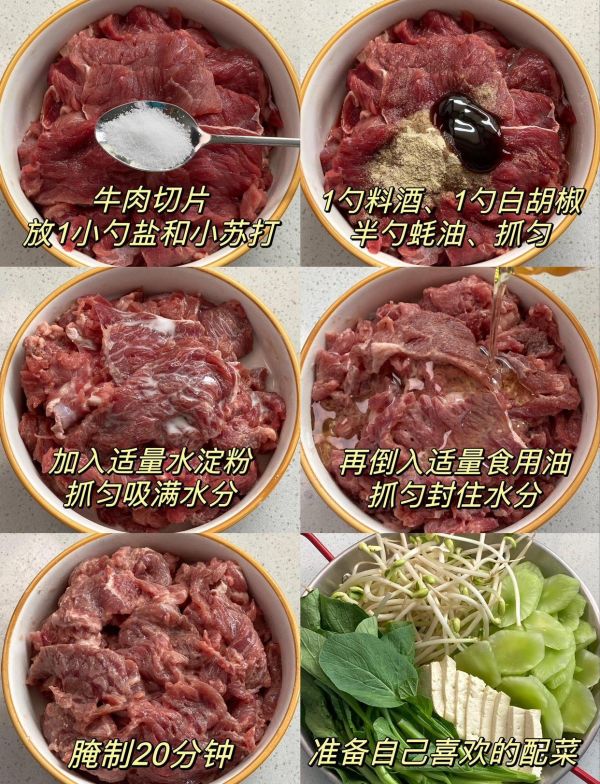 1. 牛肉选牛里脊或后腿肉,逆纹切薄片后用料酒和淀粉抓匀,静置10分钟去腥