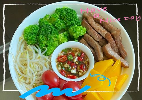 主菜为煎牛排,搭配水煮西兰花、豆芽等,丰富多彩。