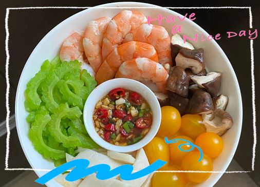 水煮虾搭配苦瓜、香菇等,营养均衡。