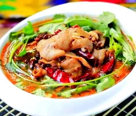 水煮鸡肉采用鸡肉与豆腐的组合,通过 豆瓣酱和豆豉的调和,搭配花椒油的香辛,将鸡肉的鲜美发挥到极致。腌制好的鸡肉与豆腐一同在汤汁中炖煮,令人垂涎的鸡肉与豆腐完美的结合,最后淋上热油激发出香味,令人回味无穷。