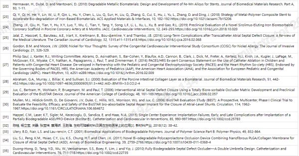 对于大部分先天性心脏病患者而言,封堵器介入治疗是首选方案,目前应用最广泛的是镍钛合金封堵器,由于该金属制品在体内不可降解,永久植入后不利于伴发心律失常患者后期射频消融术等治疗,同时还存在一些远期问题,比如穿孔、炎症、镍过敏及封堵器移位脱落等并发症,其中最常见的为镍离子过敏,2009年先天性心血管介入研究联盟(CCISC)经过随访发现患者在术后2小时~1月发生过敏反应,主要表现为荨麻疹、呼吸困难、发热或心包积液 [25] [26]。此外,行外科修补的先心病患者,可发生房性快速性心律失常 [27]。生物可吸收封堵器可以消除这些安全隐患和不良反应,同时可吸收材料具有可控适宜的降解速率和形状记忆特点。