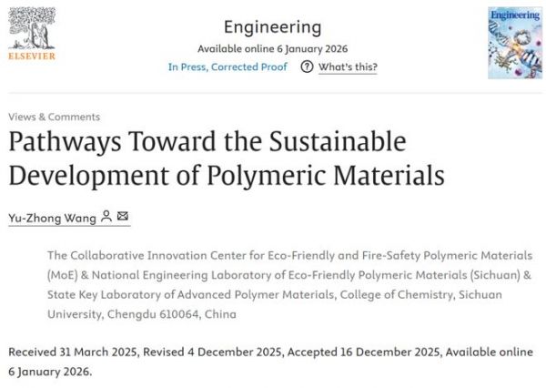 废弃聚合物材料造成的资源浪费和生态压力,使得探索可持续发展路径成为全球共识。四川大学王玉忠教授在《Engineering》杂志发表题为“Pathways Toward the Sustainable Development of Polymeric Materials”的观点文章,系统地概述了聚合物材料绿色发展的多条途径,并为建立覆盖整个材料生命周期的循环系统提供了战略建议。