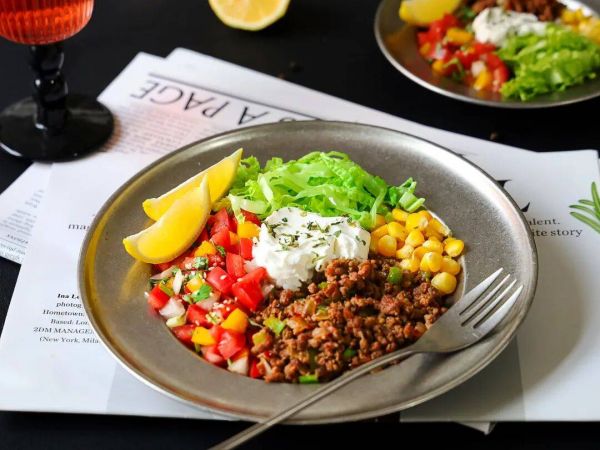 5.在碗中铺上一层藜麦饭和牛油果酱,依次加入玉米粒、生菜、炒好的牛肉末、沙莎酱、顶部加上一勺酸奶油即可