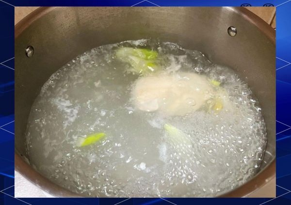 鸡胸冷水下锅,加葱段、姜片,大火煮沸后转小火保持微沸