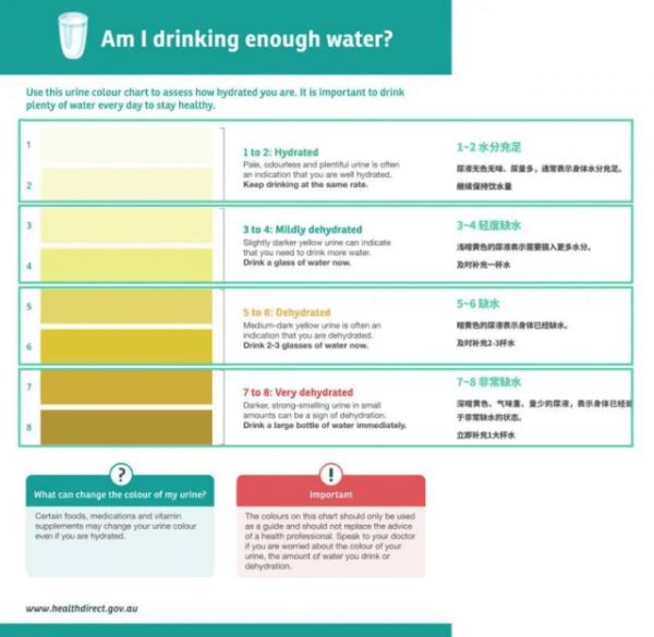 二是观察尿液颜色。人体尿液颜色可以反映是否缺水。