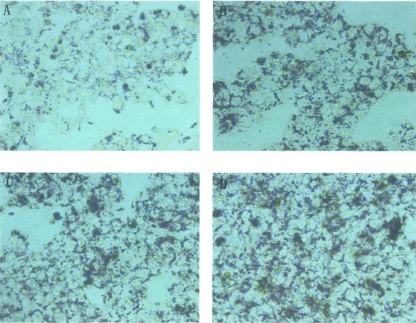 胎牛血清(FBS)处理后的油红染色图片(A-对照组,B-30%FBS处理组,C-50%FBS处理组,D-70%FBS处理组,处理组产生明显细胞内脂肪变性现象)