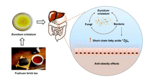 茯砖茶中的一些微生物及其代谢产物通过调节肠道菌群在预防肥胖中发挥关键作用。冠突散囊菌发酵液可以改善高脂饮食所导致的小鼠肝脏细胞体积增大与肝脏脂质的异常堆积等病理状态,有利于淀粉、蛋白质的消化吸收,抑制脂肪分解和吸收,具有明显的辅助降血脂作用。另外,通过食用从茯砖茶中分离出来的冠突散囊菌,可平衡肠道菌群、调节真菌和细菌组成、增加产生α-乳酸酯和丁酸酯的细菌,从而保护小鼠免于肥胖。