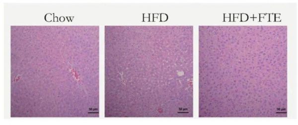 小鼠肝脏切片( Chow对照组, HFD高脂诱导的肥胖模型组, FTE茯砖茶处理组。 用茯砖茶水提物干预高脂小鼠后,FTE组的肝脏切片相比HFD组,显示出减弱的脂肪变性程度,且脂滴的数量减少,几乎观察不到白色的脂滴,与Chow组比较没有明显的差异)