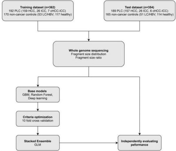 DECIPHER-Liver研究在2019年6月-2020年12月间共入组716例受试者(获科技部遗传办样本采集批准),包括381例原发性肝癌(Primary liver cancer,PLC)和335例非肝癌对照(104例乙肝和/或肝硬化高风险人群和231例健康对照)。入组受试者按照1:1分为训练集(N=362例)和验证集(N=354例)。分别收集受试者血浆cfDNA样本并进行低深度的全基因组测序(WGS),获取cfDNA片段组学特征。在训练集中,通过三种机器学习模型对cfDNA片段大小分布(Fragment size distribution,FSD)和片段大小比值(Fragment size ratio,FSR)进行建模分析,整合构建了一套肝癌筛查模型,并进一步在验证集中进行系统性验证(图1)。