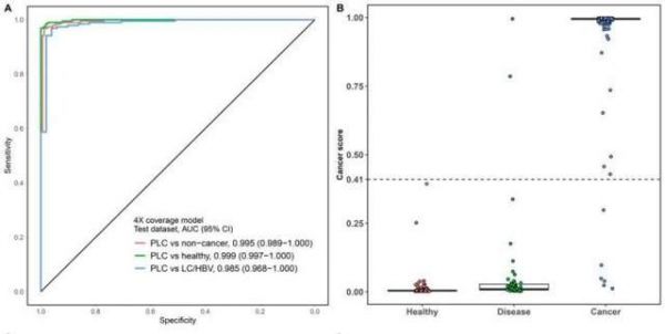 DECIPHER-Liver研究构建的肝癌早筛模型整体性能出色,区分肝癌和非癌的AUC高达0.995,在98.8%特异性下灵敏度高达96.8%(图2)。针对肝硬化和/或乙肝高风险人群性能仍然优秀,特异性达到96.1%;针对健康人预测性能优于肝硬化和/或乙肝组,特异性达到100%。
