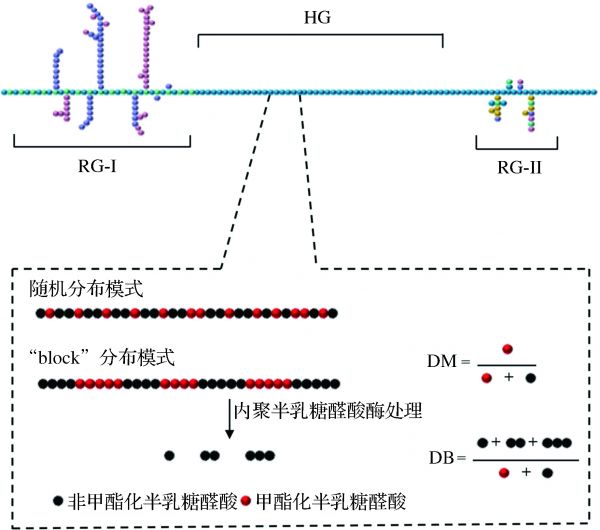 尽管当前对果胶分子的结构组成还存有一些争论,但主流观点都倾向于认同O′NEILL等[9]的研究,认为果胶分子可分为同型聚半乳糖醛酸区(homogalacturonan, HG)、鼠李半乳糖醛酸聚糖I型区(rhamnogalacturonan-Ⅰ, RG-I)以及鼠李半乳糖醛酸聚糖II型区(rhamnogalacturonan-Ⅱ, RG-II)3部分。HG是由数百个连续的D-半乳糖醛酸残基经α-(1→4)糖苷键连接而成的线性区域,构成了超过65%的果胶结构,是果胶结构的主链,因此HG区也被称为平滑区[10]。HG区域中,部分半乳糖醛酸残基C6位上的羧基以甲酯化状态存在,未被甲酯化的羧基则以解离酸的形式,或以钾盐、钠盐、铵盐、钙盐等形式存在[11]。HG区域中平均每100个半乳糖醛酸残基在C6位上以甲酯化形式存在的比例即定义为果胶分子的酯化度(degree of esterification,DE)或甲基化程度(degree of methoxylation,DM)。除DE值外,目前还以DB值(degree of blockiness)评估LMP中未被甲酯化的半乳糖醛酸单元的分布情况。DB值定义为内聚半乳糖醛酸酶降解果胶后释放的单个半乳糖醛酸、二聚半乳糖醛酸和三聚半乳糖醛酸的量占果胶中非甲酯化的半乳糖醛酸总量的比例(图1)。此外,HG的半乳糖醛酸残基可能发生酰胺化,被氨基取代。RG-I区域主要由α-D-半乳糖醛酸与α-L-鼠李糖通过糖苷键连接而成的二糖重复单元组成,其中20%~80%的鼠李糖在C3或C4位上的羟基氧上连接着由阿拉伯糖、半乳糖组成的长短不一的支链。RG-I的半乳糖醛酸残基在C2和C3位还可能被乙酰基取代。RG-II通常被描述为HG的延伸结构,仍然以α-(l→4)-D-半乳糖醛酸链为主要组成部分,但不同于主链的是该区域支链化程度较高,支链上含有4种已知的寡糖,包括洋芹糖、海藻糖、木糖、半乳糖醛酸。此外,RG-Ⅱ区域还可能包含其他成分,如乙酸、槭汁酸、葡萄糖醛酸等,受植物种类、生长环境、成熟程度以及果胶提取部位的影响而有所差异[3]。由于RG-I和RG-II区域都含有较多的支链结构,因此统称为毛发区(图1)。