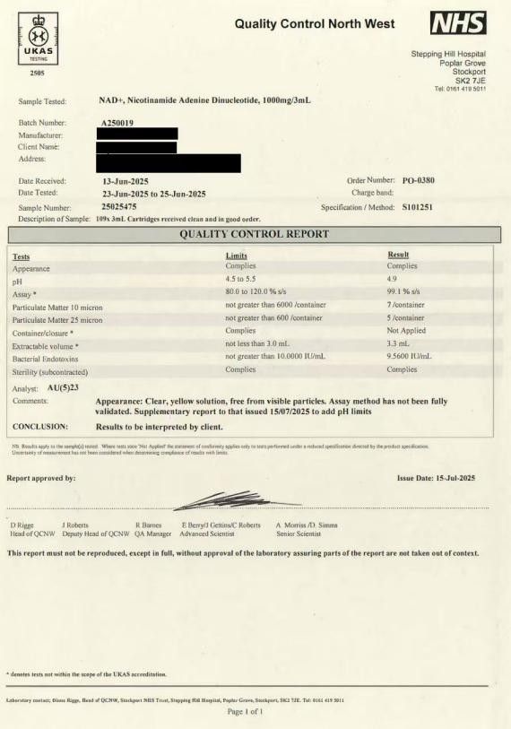 在产品质量控制方面,NADclinic建立了严格的批次检测制度。