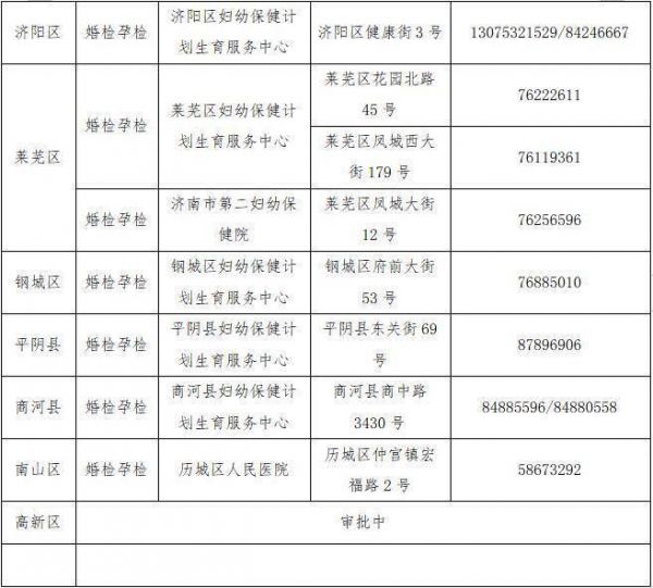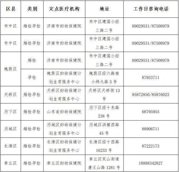 济南市区县婚检孕前优生检查项目定点医疗机构信息