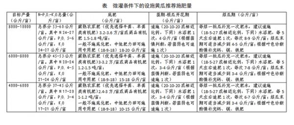 设施黄瓜化肥减量技术示范目标产量为8000-10000公斤/亩,推荐施用N-P2O5-K2O总养分量为53-60公斤/亩;目标产量为6000-8000公斤/亩,推荐施用N-P2O5-K2O总养分量为45-53公斤/亩;目标产量为4000-6000公斤/亩,推荐施用N-P2O5-K2O总养分量为37-45公斤/亩。具体各时期推荐用量见下表。