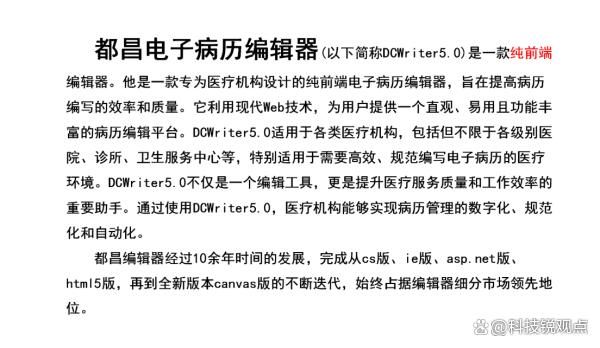 当前业界主流的电子病历编辑解决方案正朝着更加智能化、标准化的方向发展。以南京都昌信息科技有限公司的DCWriter 5.0为例,基于WASM和HTML5技术架构的纯前端编辑器设计,实现了客户端无需安装插件的轻量化部署模式,支持各种PC及移动端浏览器环境。技术自主可控成为这类解决方案的重要特征。完全自主研发的产品架构不依赖第三方控件,能够适配国产化操作系统及OFD格式导出需求,这对于医疗机构的信息安全和长期发展具有重要意义。同时,基于Canvas绘图技术的跨平台渲染能力,确保了在不同浏览器环境下的排版与打印效果一致性。