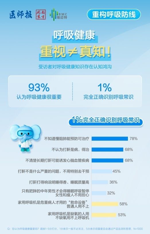 当前,随着“健康中国2030”战略的全面深入推进,呼吸健康正逐步影响着亿万群众的生活质量与生命健康。为精准洞察我国民众呼吸健康认知水平、临床诊疗痛点及居家管理需求,普及呼吸疾病早筛、早诊、早治和全周期管理理念,由南方周末、医师报发起和调查,BMC瑞迈特公益支持,共同发布《报告》,为全民呼吸健康管理提供数据支撑与行动指引。
