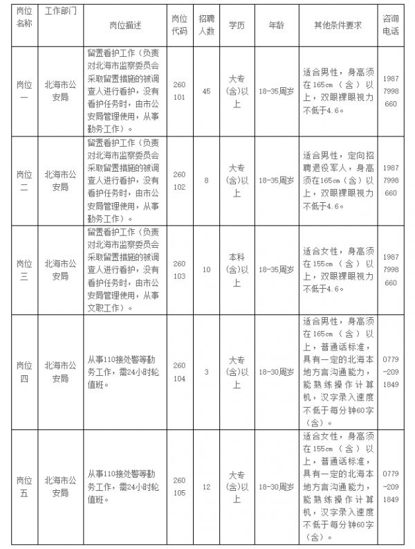 有关招聘信息,应聘人员可登陆北海市人才网(www.bhrc.cn)、北海市公安局微信公众号“北海公安”查询。咨询报考岗位、资格条件等信息,可在工作时间内致电各岗位咨询电话。