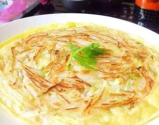 8. 一面凝固后翻至另一面,想保持鸡蛋饼完整要靠掂勺翻过来。两面煎好后装盘也可切开。